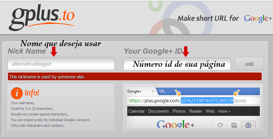 O sistema funciona com o um redirecionamento seu link ficará assim " http://gplus.to/nomedapagina " ao clicar o leitor será redirecionado a sua página oficial de fãs. Faça um teste em minha página de fãs e aproveite para nos seguir no Google Plus http://gplus.to/alternativablogger.